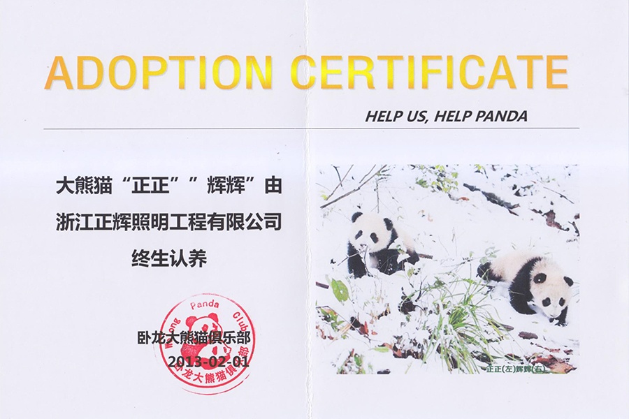 Zhenghui Company has adopted two giant pandas for life and named them: Zhengzheng and Huihui. Zhenghui Company is committed to green lighting and advocates energy-saving and environmental protection. Care for the environment. In 2013, Zhenghui Company reached an agreement with the Wolong Giant Panda Club of the China Research Center for the Protection of Giant Pandas. Zhenghui Company adopted two giant pandas for life. They were named Zhengzheng and Huihui, demonstrating our corporate social responsibility and efforts in environmental protection.